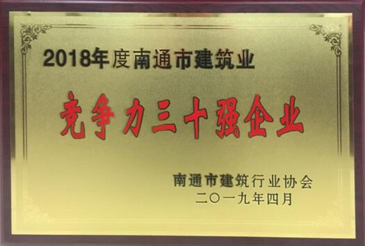 南通市“雙三十強”企業(yè)評價(jià)工作旨在激勵引導全市建筑施工企業(yè)堅持科學(xué)發(fā)展,加快轉型升級,加強品牌建設,不斷做優(yōu)做強,展示南通市建筑業(yè)爭先創(chuàng )優(yōu)的良好社會(huì )形象。集團連續多年獲此榮譽(yù)稱(chēng)號,是南通市建筑業(yè)協(xié)會(huì )對集團求實(shí)創(chuàng )新、不懈奮斗、埋頭苦干的肯定,更是對集團今后抓好轉型升級,深化改革,實(shí)現高質(zhì)量發(fā)展的有力鞭策。